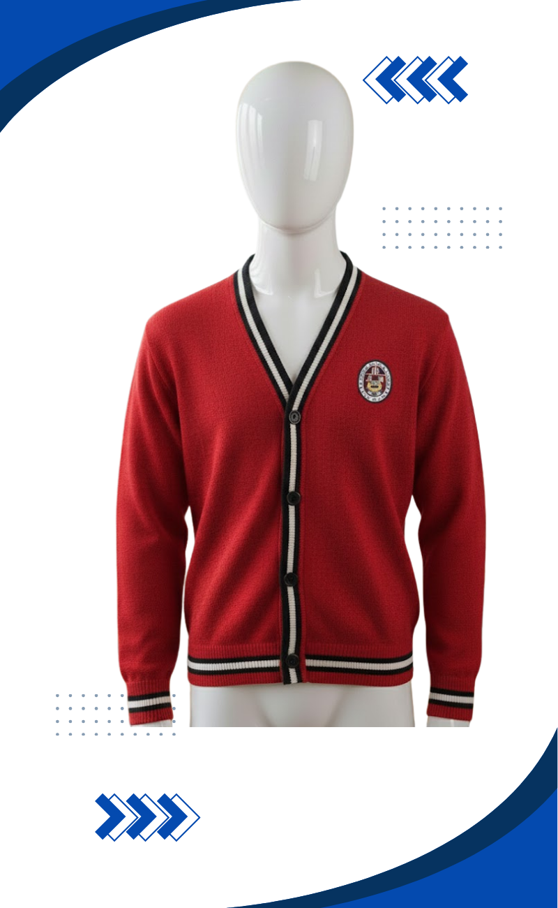 Chompa escolar tipo saco elaborada en lana Dralon Cromotex, diseñada con 5 botones frontales y tejido en punto jersey. Cuenta con bordado institucional, puños y pretina doble para mayor resistencia, y cuello cerrado con platilladora que asegura un acabado de alta calidad. Reforzada con hombreras y remalle, perfecta para uniformes escolares.